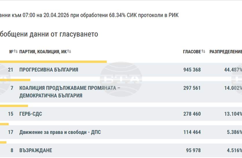 Централната избирателна комисия (ЦИК) публикува на сайта си междинни резултати при обработени 68,34% протоколи на секционните избирателни комисии (СИК) в районните избирателни коми ...