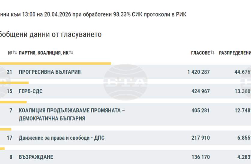 Централната избирателна комисия (ЦИК) публикува на сайта си междинни резултати при обработени 78,24% протоколи на секционните избирателни комисии (СИК) в районните избирателни комисии (РИК). Данните са към 8:00 ч. Резултатите от изборите на 19 април за народни представители за 52-рия парла ...
