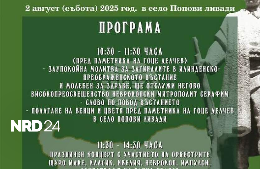 Гоце Делчев ще отбележи 122 години от избухването на Илинденско-Преображенското въстание с традиционен събор в село Попови ливади, съобщиха от пресцентъра на Община Гоце Делчев. Събитието ще е на 2 август, събота, и ще започне в 10:30 часа с възпоменателна церемония пред паметника на Гоце Делчев в местността Попови ливади. Там ще бъде отслужена заупокойна молитва за загиналите във въстанието и молебен за здраве от Неврокопския митрополит Серафим, след което ще бъдат поднесени венци и цветя, посочиха от Общината.