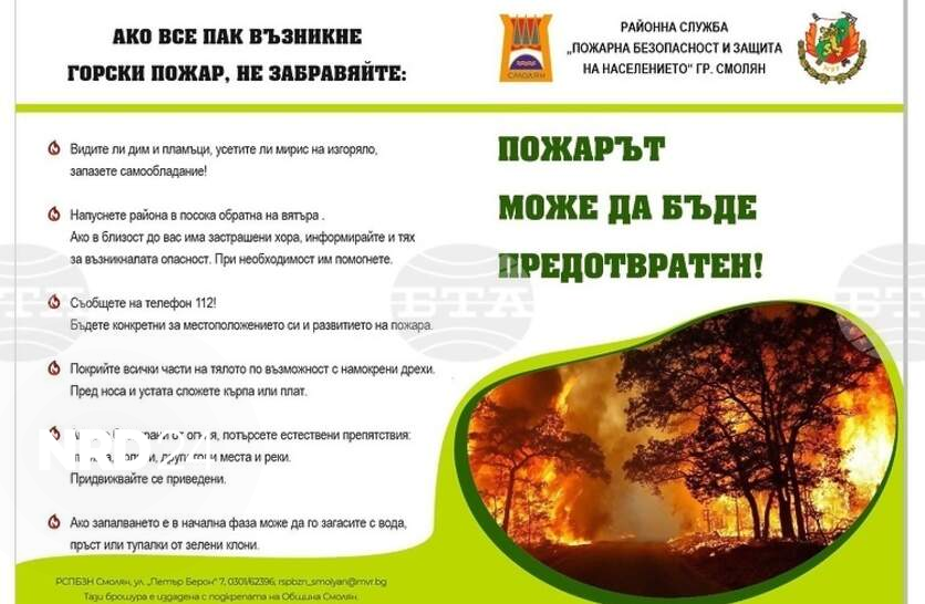 Пожарната в Смолян издаде информационна брошура за недопускане на горски пожари, каза Елена Стоилова – говорител на Областната дирекция на МВР. В брошурата, озаглавена „Пожарът може да бъде предотвратен“, са дадени редица препоръки, сред които да не се пали огън на открито, да не се изхвърлят фасове или жар в сухи треви, горски територии и дворове. Огнеборците дават примери как да се реагира при сблъсък с горски пожар и какви мерки да се предприемат. От Регионалната дирекция „Пожарна безопасност и защита на населението“ в Смолян напомнят, че до 30 ноември е в сила пожароопасният сезон в областта. А паленето на открит огън в гори, земеделски земи, дворове и в близост до горския фонд е строго забранено, като нарушителите носят административна отговорност.