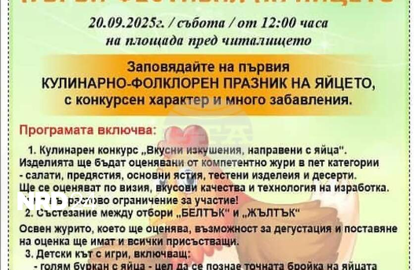 Първи фестивал на яйцето подготвят в търговищкото село Васил ЛевскиПърви фестивал на яйцето подготвят в търговищкото село Васил Левски.Празникът ще се състои на площада в центъра на 20 септември, като организаторите канят местни и гости да се включат в разнообразната програма.