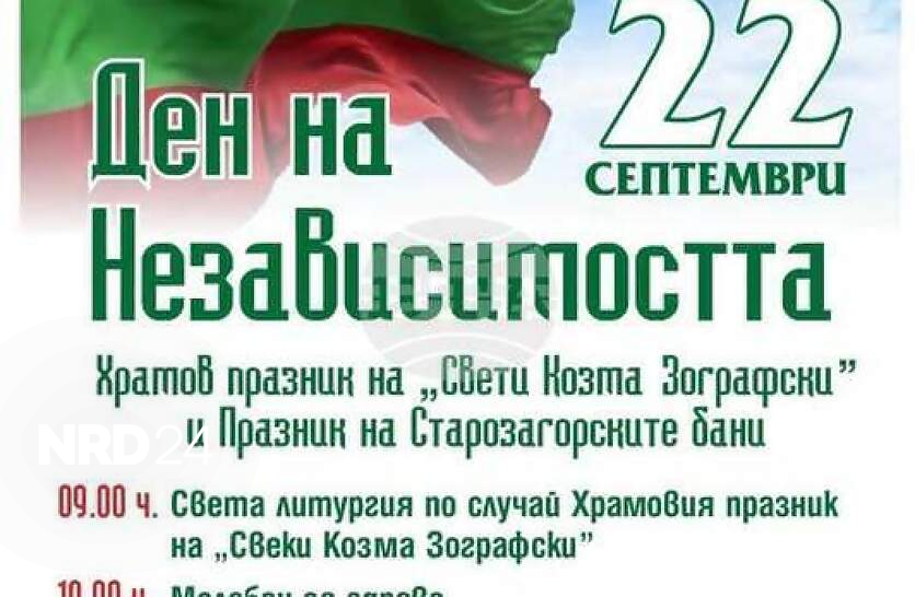 В Деня на Независимостта- 22 септември, курортното селище Старозагорски бани ще отбележи своя празник. Това съобщават от пресцентъра на община Стара Загора. Оттам допълват, че своя храмов празник празник ще отбележи и църквата „Свети Козма Зографски“, намираща се в селото. Празничният ден ще започне със Света литургия и молебен за здраве. И ще продължи на площада пред читалището, където ще се състои празничен концерт. За доброто настроение на жителите и гостите на населеното място ще се погрижат Певческа група „Зорница“, танцова група „Еньовче“ и формация за народна музика „АСУС“. Програмата е организирана от кметството на Старозагорски бани, Църковно настоятелство, Народно читалище „Христо Ботев – 1952“ и Пенсионерски клуб, със съдействието на община Стара Загора. Припомняме, че на 22 септември в Стара Загора с ритуал под надслов „В памет на големите български държавници“ ще бъде отбелязана паметната дата. Празничната програма ще започне с молебен, отслужен от старозагорското свещеничество, в Митрополитския храм „Св. великомъченик Димитър“, а през деня ще има два концерта на сцената пред община Стара Загора. Курортното селище Старозагорски бани е балнеологичен курорт, разположен на 12 км северозападно от Стара Загора. Традиционно в края на август селото е домакин на Националния тракийски фолклорен събор „Богородична стъпка“ .