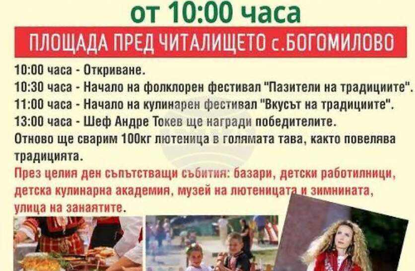 На Третия празник на зимнината в старозагорското село Богомилово ще сварят сто килограма лютеницаУтре, 27 септември, в старозагорското село Богомилово ще се сварят сто килограма лютеница по време на Третия празник на лютеницата и зимнината.Това съобщават организаторите от местното Народно читалище „Иванка Терзиева – 1927“ на официалната си Фейсбук страница.