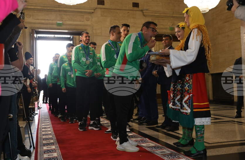 Състезателите от националния отбор по волейбол бяха посрещнати с питка и мед в Народното събрание от председателя на парламента Наталия Киселова и от министъра на спорта Иван Пешев.