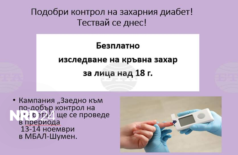Целта на инициативата, организирана под надслов "Заедно за по-добър контрол на диабета", съвместно с Регионалната колегия на Българската асоциация на професионалистите по здравни грижи (БАПЗГ), е да бъдат подкрепени хората, диагностицирани с диабет в тяхната борба за контрол на кръвната захар. В рамките на кампанията безплатно ще се изследва кръвна захар на хора над 18 години, на 13 и 14 ноември, от 9:00 ч. до 11:00 ч., в обособен кабинет в Терапевтичен блок на четвъртия етаж в МБАЛ-Шумен. Там ще бъде предоставяна също информация относно превенцията и значението на здравословния начин на живот, уточняват от болницата.