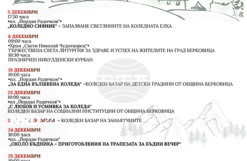 Община Берковица организира разнообразна програма от събития за посрещане на коледните и новогодишните празници, съобщиха от местната администрация. На 5 декември на централния площад „Йордан Радичков“ ще бъдат запалени светлините на коледната елха, а в събитието, наречено „Коледно сияние“, ще се включат деца от детските градини в общината. На 6 декември в храма „Свети Николай Чудотворец“ в Берковица ще бъде отслужена тържествена литургия за здраве и успех на жителите и гостите на Берковица и ще бъде даден безплатен Никулденски курбан. На 19 декември на площада в Берковица ще има базар със стоки, изработени от децата в детските градини, а на 23 декември – от децата и младежите от социалните домове в общината. На 24-ти, 25-и и 26 декември на същото място ще има базар на занаятчиите от община Берковица. В 10:00 часа на 24 декември на площада ще има ритуал по подготвяне на трапезата за Бъдни вечер, наречен „Около Бъдника“. Събитието се организира за пръв път в Берковица и е с амбицията да потопи местните хора и гостите на града в коледните традиции и аромати на българската трапеза, на която всеки ще може да се наслади безплатно. Инициативата за тази проява е на Община Берковица със съдействието на МИГ-Берковица, Годеч и Драгоман, читалищата от община Берковица, Музейния комплекс в Берковица и фирма "Агрофитнес" от село Боровци в община Берковица. На 25 декември ще има работилница за деца с Дядо Коледа и празничен концерт с участието на фолклорния изпълнител Светлин Миланов, на 26 декември – концерт на оркестър „Щуро Маке“. На 31 декември новата година ще бъде посрещната на площада с общонародно веселие с Мирослав Тошев, берковските музиканти и заря.