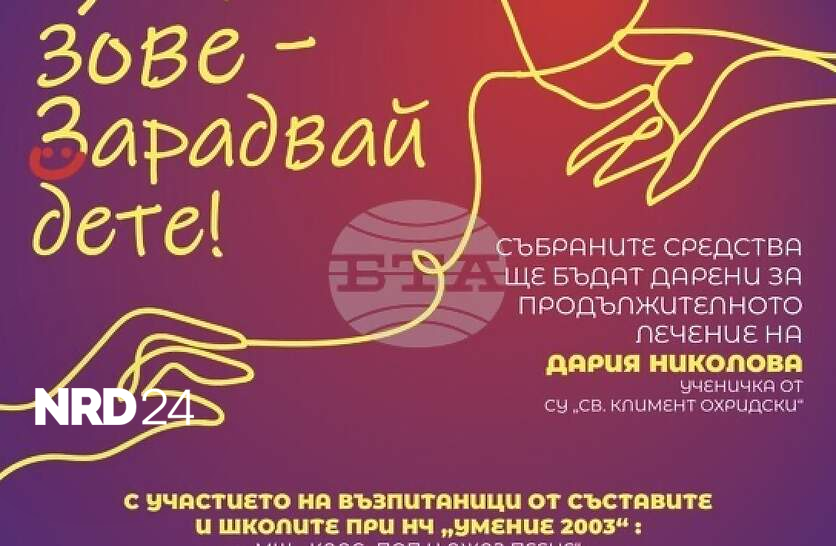 Под мотото „Доброто зове – зарадвай дете!“ на 24 ноември от 18:00 ч. в голямата зала на Община Ямбол ще се състои благотворителен концерт в подкрепа на 12-годишната Дария Николова, която се бори с наследствена моторно-сензорна невропатия – тежко генетично заболяване, засягащо мускулите и двигателните способности. Това съобщи 18-годишният Станислав Георгиев, който е сред организаторите. Концертът се организира от Народно читалище „Умение – 2003“. Ще участват възпитаници на школите по поп и джаз пеене, танцов състав „Радика“, школите по народно пеене „Росица“ и по рисуване „Слънце“ към читалището. Специални гости ще бъдат певицата Ралица Грудева и младата изпълнителка Поля Иванова. Във фоайето на залата ще се продават и картини, като събраните средства също ще бъдат дарени за каузата. За лечението на Дария са необходими 30 хил. евро, а сумата е непосилна за семейството . Надежда дават лекари от клиника в Турция, с възможности за лечение и терапии, които биха могли да помогнат за подобряване на състоянието , както и да има шанс за по-добро бъдеще, посочи Станислав Георгиев. Билети за концерта могат да бъдат закупени на различни локации в града, както и на място във фоайето на залата в деня на събитието. Целта е чрез музика и изкуство да се съберат средствата за лечението и да бъде подарена надежда на едно дете, което мечтае за нормално детство, посочиха организаторите.