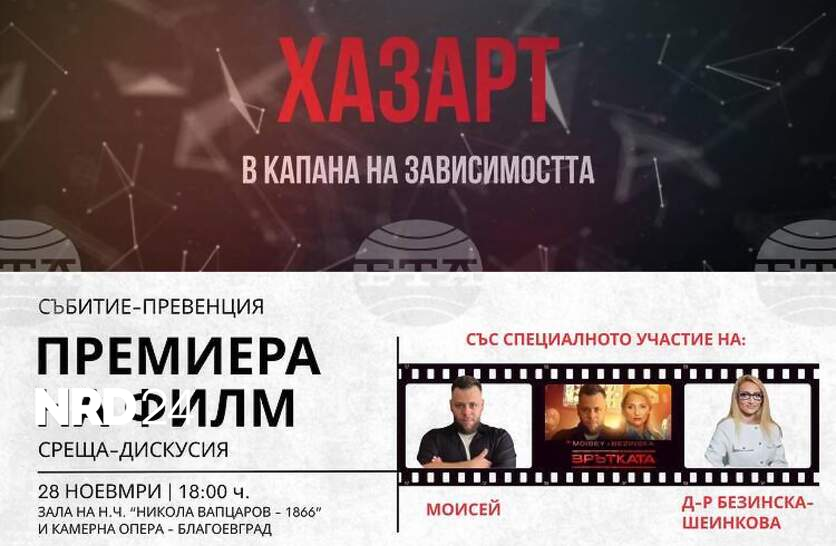 С дискусия и филм Младежки център – Благоевград насочва вниманието към опасностите от хазартната зависимост, съобщиха от центъра. На 28 ноември от 18:00 часа в залата на читалище „Никола Й. Вапцаров“ и Камерна опера – Благоевград ще бъде представен премиерно филмът „Хазарт. В капана на зависимостта“. От Младежкия център посочиха, че филмът представя реални истории, психологически механизми и последствията от попадане в хазартната спирала. Целта на прожекцията е да се повиши осъзнатостта и да се насърчи отговорното отношение сред младите хора. В началото на събитието е предвидена и дискусия с психолози, които ще споделят как се развива хазартната зависимост, кои са ранните сигнали и рискови фактори, как младежите могат да разпознаят опасността и къде да потърсят помощ за себе си или близък човек. Инициативата цели да информира, да подкрепя и да създаде пространство за открит разговор, посочиха от Младежки център – Благоевград.