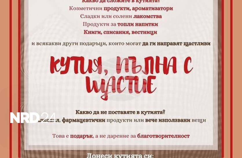 За поредна година доброволци на казанлъшките сдружения Младежки център за развитие "Взаимопомощ" и "Юнайтед Авангард Артист" организират коледна инициатива за живеещите в Дом за стари хора №3. Това съобщи председателят на "Взаимопомощ" инж. Мария Славова. Акцията е под надслов "Кутия, пълна с щастие", а всички желаещи могат да се включат в нея в периода от 15 до 22 декември. Желаещите да зарадват възрастните хора трябва да напълнят кутия от обувки с малки подаръци. Вътре могат да се сложат кремове, сапуни, парфюми и други козметични продукти, сладки и солени лакомства или продукти за топли напитки, както книги. Мария Славова отбеляза, че в кутиите не може да се поставят алкохол, фармацевтични продукти или вече използвани вещи. Тя подчерта, че това е подарък, а не дарение, а целта на доброволците е да споделят коледния дух с възрастните хора в Дома.