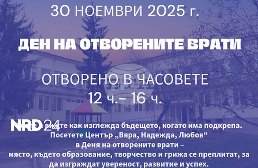 Ден на отворените врати в терапевтична общност „Вяра, Надежда, Любов“ ще се състои на 30 ноември. Това съобщиха от Фондация „Общност в помощ на зависимите“. Денят на отворените врати ще бъде тази неделя от 12:00 до 16:00 ч. в центъра в село Радовци, община Дряново. Организаторите посочват, че във време, когато все повече младежи са уязвими към негативни влияния, рисково поведение и употреба на психоактивни вещества, ние във „Вяра, Надежда, Любов“ показваме, че има възможност и алтернатива – среда, в която подкрепата, образованието и човешката връзка вървят ръка за ръка. Посетителите ще могат да посетят цялата общност и база, класната стая, зоната за динамично учене и пространствата за групова терапия, да се срещнат с екипа – консултанти с личен опит, психолози, терапевти и педагози, които работят всеки ден с младежите е техните семейства. Център „Вяра, Надежда, Любов“ е терапевтична общност за подкрепа и развитие на младежи в риск и техните семейства, създадена от Фондация „Общност в помощ на зависимите“.