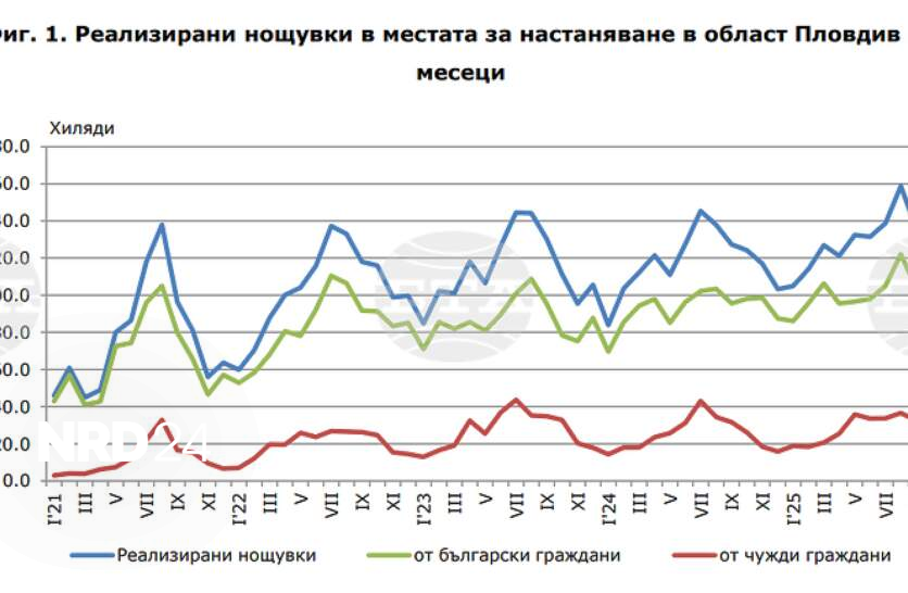 Нощувките в Пловдивска област през октомври нарастват с 7,7 на сто до 133 900Общият брой на нощувките във всички места за настаняване в Пловдивска област през октомври 2025 г. достига 133 900, сочат данните на Териториалното статистическо бюро – Юг към Националния статистически институт.Отчетено е увеличение от 7,7 на сто спрямо същия месец на предходната година.