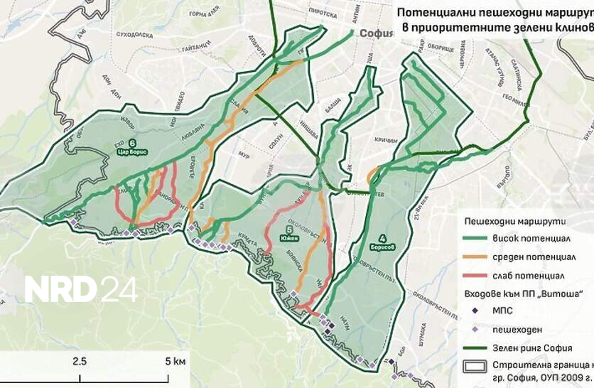 Нов план на Столична община, част от „Визия за Витоша“, предвижда четири коридора да свързват зелените пространства на града с пътеките в планината, съобщиха от пресцентъра на Общината. Планът е изработен от общинското предприятие „Софияплан” и има за цел да осигури по-лесен, зелен и приятен достъп от града до планината, с директни и удобни подходи за пешеходци и велосипедисти, като насърчава активния начин на живот и опазването на околната среда. Като първи приоритетен маршрут в плана е заложена връзката между НДК и централната част на града с Природен парк „Витоша” в района на кв. „Бояна”. Трасето преминава през Южния парк, като използва и доразвива съществуващата пешеходна и велосипедна мрежа, и се свързва със Зеления ринг на София в района на ул. „Хенрик Ибсен”. Маршрутът продължава по течението на река Перловска и през кв. „Манастирски ливади - изток”, където е предвидено изграждането на линеен парк по река Боянска бара с обособени алеи за разходки и колоездене, озеленяване и обществено достъпна крайречна зона. Преминаването през основни булеварди като бул. „България” и през Софийския околовръстен път е предвидено чрез съществуващи пешеходни и велосипедни връзки, които ще бъдат подобрени, без изграждане на нови рискови пресичания, добавят от Столична община. В участъка от „Манастирски ливади“ към кв. „Бояна“ маршрутът следва конкретни улици - ул. „Васил Стефанов” и ул. „Даскал Стоян Попандреев”, където се предвиждат нови или подобрени тротоари и велосипедна инфраструктура. В „Бояна“ трасето осигурява връзка с Боянската църква и с няколко начални точки на пешеходните алеи към Природен парк „Витоша”. „Зелените коридори са поредната стъпка напред към реализиране на „Визия за Витоша“ - да направим планината достъпна през цялата година, като същевременно опазим природата. Искаме да свържем града и Витоша не само с лифтове и автомобилни пътища, а чрез зелени и спокойни маршрути, които насърчават движението и времето навън“, заяви кметът на София Васил Терзиев, цитиран в съобщението. Докладът, изготвен от „Софияплан”, съдържа анализ и конкретни насоки за развитие на мрежа от пешеходни и велосипедни маршрути. Той включва анализ на съществуващата правна рамка, както и екоанализ на зелените клинове и реките в южната част на града. В него е включена и концепция за четири основни зелени коридора, които ще свържат градските паркове с природния парк, оценка на възможностите за изграждане на пешеходна и велосипедна инфраструктура в тези зони с минимално въздействие върху природата, както и план за действие за реализиране на приоритетен маршрут между НДК и Природен парк „Витоша“ (кв. „Бояна“). Резултатите от анализа ще са основа за по-детайлни проучвания и инвестиционни проекти, които да осигурят пълноценно и природосъобразно свързване на града и планината. Заложено е и изготвяне на план за действие за реализирането на втория приоритетен маршрут - от парк „Борисовата градина” до Природен парк „Витоша” по течението на река Драгалевска. Следващата стъпка е подготовката за възлагане на инвестиционни проекти за два от коридорите, които ще бъдат реализирани в следващите две години. „С тази концепция поставяме основата на бъдеща зелена мрежа, която ще направи движението пеша и с колело към Витоша не само възможн