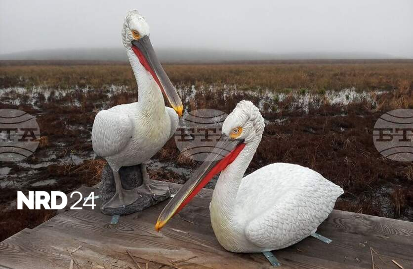 Два макета на къдроглави пеликани са поставени на платформа в резервата „Сребърна“Макетите трябва да привличат вниманието на защитените птици за гнездене.Това е практика, доказала ефект в нови гнездови находища в страната като блатата на остров Персин и в Защитената местност Калимок - Бръшлен.
