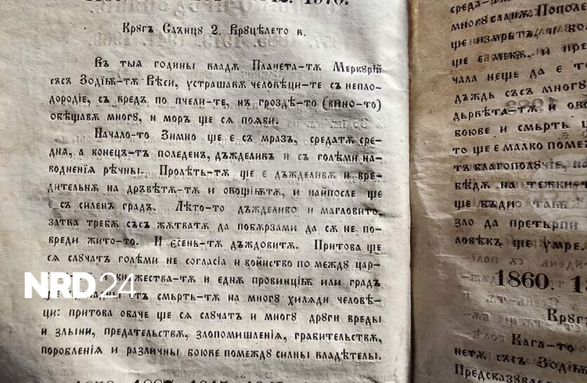Любопитни предсказания за бъдещето съдържа "Вечен календар“ от 1860 г., който се съхранява във фонда на Регионалния исторически музей във Видин. Календарът, познат още като "Месецослов“ или "Календар вечний“, е трето издание, отпечатано през 1860 г. в Букурещ от Пенчо Радов. По думите на Асенов, изданието е било широко разпространено – само за Видин са били поръчани 73 екземпляра. Предходното, второ издание е от 1857 г., издадено в Белград, като тогава за града са били заявени 114 книги. В календара е заложена строга цикличност – събитията се повтарят на всеки 28 години, обясни етнографът. Според календара 2026 година попада под влиянието на планетата Меркурий. Предсказанията за този период са, че се очакват се неплодородие, мор по пчелите и различни природни бедствия. Зимата ще започне с мраз, средата ще бъде по-умерена, а краят – с опасни поледици. Пролетта ще е дъждовна и ще нанесе щети на овошките, като се предвиждат и силни градушки. Лятото и есента също ще бъдат дъждовни, което според календара няма да е благоприятно за житните култури. Очаква се още мор по пчелите и слаба реколта от грозде. "Вечният календар“ вещае обществени сътресения. Предсказани са несъгласия и войни между царствата. В текста се говори още за "много други вреди и злини, предателства, злопомишления, грабителства, поробления и различни боеве между силни владетели“ в целия свят. "Картината, която календарът рисува, е на година, изпълнена с хаос и изпитания“, обобщи Тихомир Асенов, като допълни, че единствената надежда, според старинното издание, остава в мъдростта на хората, които могат да променят хода на събитията.