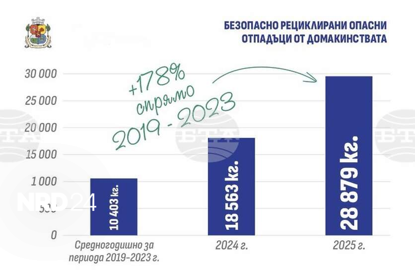 Рекордно количество от 28 879 килограма опасни отпадъци са предали жители на София през 2025 г.Рекордно количество от 28 879 килограма опасни отпадъци са предали жители на София през 2025 г., съобщиха от Столичната община на сайта си. Това е над десет тона повече в сравнение с рекордната 2024 г. (18 562 кг.) и близо три пъти повече от средногодишното количество за периода 2019–2023 г. (10 403 кг.), допълват от Общината.Най-голям е обемът на предадените бои, лакове, латекс, грундове - над 10 тона, следвани от лекарства с изтекъл срок на годност - над 9,5 тона. Перилни и почистващи препарати също са сред най-предаваните.
