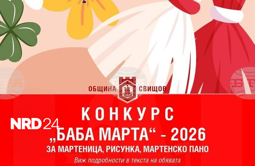 Община Свищов обяви ежегодния конкурс за рисунка, мартеница и мартенско паноДо 17:00 часа на 20 февруари 2026 г. ще се събират творбите на желаещите да участват в ежегодния конкурс за рисунка, мартеница и мартенско пано на Община Свищов, съобщиха от общинската администрация.Участие могат да вземат учебни и социални заведения, неправителствени организации, културни институции, творчески формации, държавни и общински учреждения, ученици, семейства и граждани, уточниха от Общината.