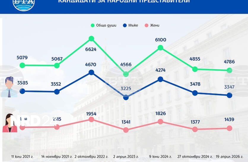 Жените са 30,1% от кандидатите за народни представители на изборите на 19 април, което е ръст от 1,7 процентни пункта спрямо вота през октомври 2024 г., но делът им остава под 1/3 от общия брой. На изборите през април жените кандидати за депутати са 1439 от общо 4786 души, докато мъжете са 69,9% (3347 кандидати), съобщи в четвъртък заместник-председателят на Централната избирателна комисия (ЦИК) Росица Матева. На предстоящите избори ще има 62 жени кандидати за народни представители повече спрямо тези в края на 2024 г. Съотношението обаче остава в полза на мъжете. За вота през април са регистрирани 69 кандидати за депутати по-малко спрямо този на 27 октомври 2024 г. За сравнение, на изборите на 27 октомври 2024 г. жените са били 28,4% - 1377 от общо 4855 кандидати, а мъжете - 71,6% - 3478 кандидати. Делът на жените в националните парламенти в Европейския съюз (ЕС) Данните за България могат да бъдат разгледани на фона на тенденциите в ЕС. Делът на жените в националните парламенти на страните от ЕС се е увеличил през последното десетилетие, с изключение на Германия, предаде в началото на март ДПА, позовавайки се на данни, публикувани вчера от европейската статистическа агенция Евростат. През 2025 г. в България жените съставляват 25% от законодателите, ръст с близо 5,5 процентни пункта спрямо 2015 г. Жените са заемали 33,6% от местата в националните парламенти на страните от ЕС през 2025 г., което е с 5,4 процентни пункта повече в сравнение с 2015 г., сочат данните. Финландия има най-голям дял на жени в парламента през 2025 г. - 46%, следвана от Швеция с 44,8% и Дания с 44,7%. С най-нисък дял е Кипър - 14,3%, следван от Унгария с 15,6% и Румъния с 22%. В повечето страни от ЕС делът на жените в националните правителства също е нараснал спрямо 2015 г. Най-голямо увеличение се наблюдава във Финландия. Спад в дела на жените е регистриран в шест държави от ЕС: Румъния, Словения, Чехия, Нидерландия, Белгия и Полша. Кандидати за депутати на изборите 11 юли 2021 г. - кандидати за депутати - 5079, от които 1494 жени и 3585 мъже. 14 ноември 2021 г. - кандидати за депутати - 5067, от които 1515 жени и 3552 мъже. 2 октомври 2022 г. - кандидатите за депутати - 6624, от които 1954 жени и 4670 мъже. 2 април 2023 г. - кандидати за депутати - 4566, от които 1341 жени и 3225 мъже. 9 юни 2024 г. - кандидати за депутати - 6100, от които 1826 жени и 4274 мъже. През април ще е осмият парламентарен вот от 2021 г. насам. На 4 април 2021 г. се проведоха редовни парламентарни избори, след което шест предсрочни вота. Изборите на 19 април ще бъдат седмите предсрочни след редовните на 4 април 2021 г.