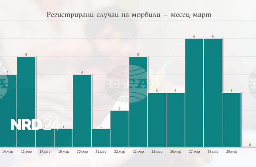 Общо 43 случая на морбили са регистрирани в три области в страната, съобщиха от Министерството на здравеопазването (МЗ). От тях 37 са в община Бяла Слатина, два – в община Плевен и по един случай – в общините Козлодуй, Луковит, Ябланица и Ловеч. Лабораторно потвърдени са 21 проби, като за останалите това се очаква, посочиха още от ведомството. Всеки случай на морбили своевременно се съобщава и регистрира в Информационната система за събиране и анализиране на данни за заболяемостта от морбили, паротит и рубеола в България. Провеждат се епидемиологични проучвания за определяне на контактните лица и техния имунизационен статус. При необходимост същите се насочват за имунизация към общопрактикуващите им лекари, допълниха от ведомството. Продължава издирването и обхващането на деца с пропуснати имунизации, както и такива подлежащи през настоящата година на задължителна имунизация или реимунизация срещу морбили. От здравното министерство апелират всички родители да проверят имунизационния статус на своите деца и при пропуск да се обърнат към личния лекар в най-кратък срок. Навременната имунизация е най-сигурният начин да предпазим децата си от тежко протичане на заболяването и да ограничим разпространението му, подчертаха от ресорното министерство и припомниха, че на специализирания им сайт за имунизациите в България „Плюс мен“ може да се видят митове и факти, свързани с ваксината срещу морбили. Информацията за броя заболели ще бъде актуализирана ежедневно в края на всеки работен ден на официалния сайт на Министерството на здравеопазването. На 19 март здравното министерство информира за осем случая на морбили в община Бяла Слатина и разпореди провеждането на извънредна имунизация в страната на всички деца с пропуснати ваксини. Засега заразата от морбили в Бяла Слатина е локализирана, но повечето от заразените деца не са ваксинирани, съобщи служебният здравен министър Михаил Околийски миналата седмица.