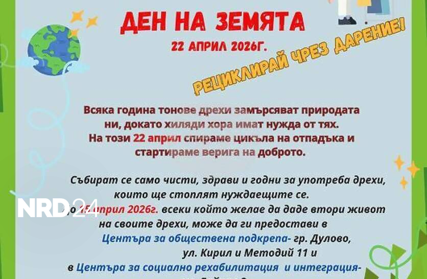 В Дулово ще отбележат Деня на Земята с кампания за даряване и рециклиране на дрехиОбщина Дулово организира кампания по повод Деня на Земята – 22 април, насочена към насърчаване на повторната употреба на текстил и подпомагане на хора в нужда. Инициативата преминава под мотото „Земята ни облича – нека я пазим. Втори живот за нашите дрехи“.Това съобщиха от администрацията на официалната си страница във Фейсбук.
