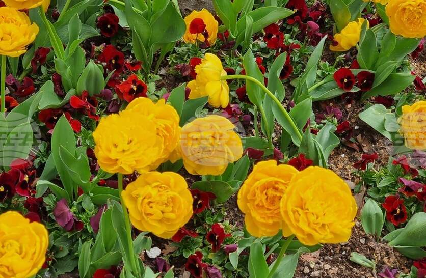 Кичести холандски лалета и виоли оформят цветните композиции в Сливен