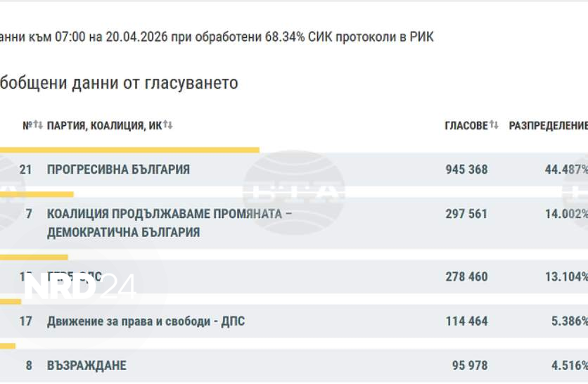 Централната избирателна комисия (ЦИК) публикува на сайта си междинни резултати при обработени 68,34% протоколи на секционните избирателни комисии (СИК) в районните избирателни комисии (РИК). Данните са към 7:00 часа. Резултатите от изборите за народни представители за 52-рия парламент, произведени на 19 април, показват следното разпределение: „Прогресивна България“ – 44,487% „Продължаваме промяната – Демократична България“ (ПП – ДБ) – 14,002% ГЕРБ – СДС – 13,104% Движение за права и свободи (ДПС) – 5,386% „Възраждане“ – 4,516% Според Изборния кодекс ЦИК трябва да обяви получените гласове и разпределението на мандатите между партиите и коалициите не по-късно от четири дни след изборния ден, а имената на избраните народни представители – не по-късно от седем дни след изборния ден. Вчера в страната се състояха осмите избори за Народно събрание от 2021 г. насам.