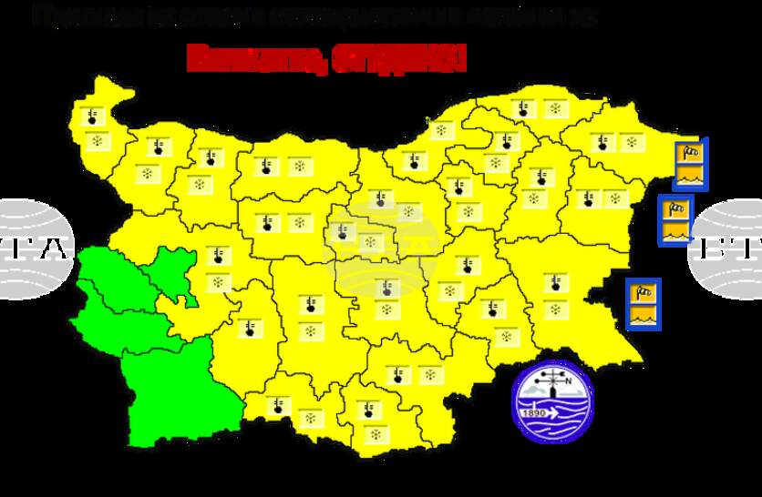 Жълт код за ниски температури и снеговалежи е обявен днес в почти цяла България, ...